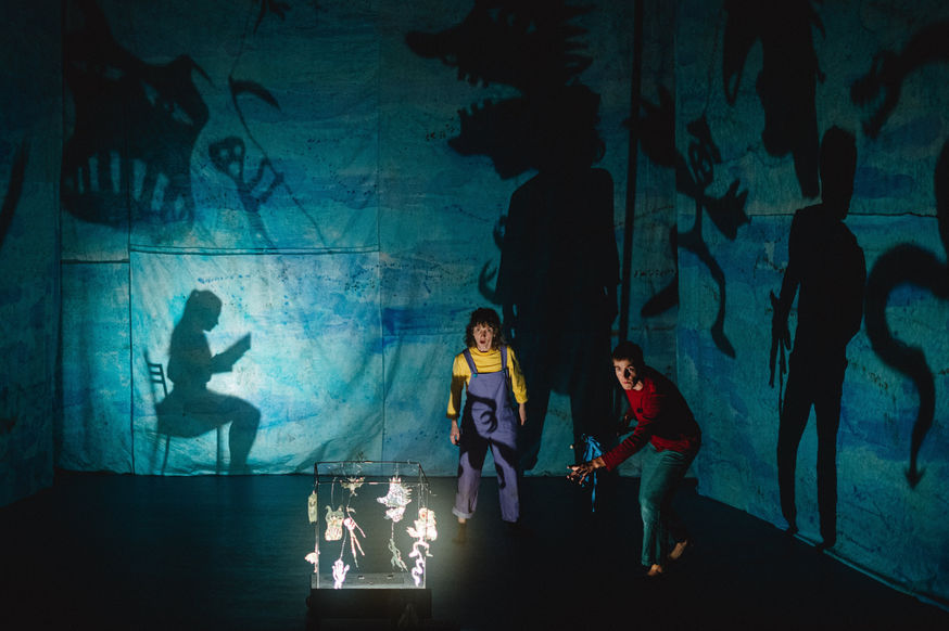 ombres immenses projetées à l’aide de simples jouets. La scénographie évoque la mer ayant déteint sur l’ensemble de l’espace.